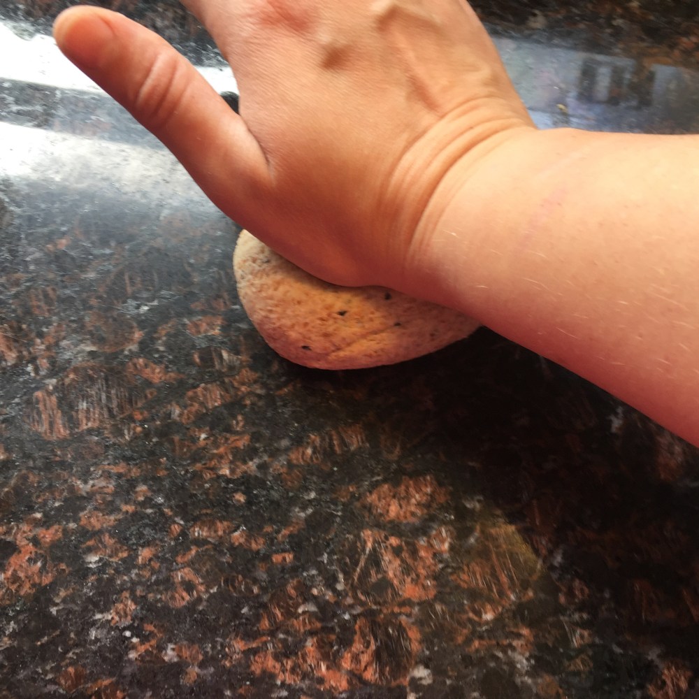 On a floured surface, with a rolling pin roll each ball in to an oval about the thickness of a pound coin. Try and make sure they are all the same thickness.