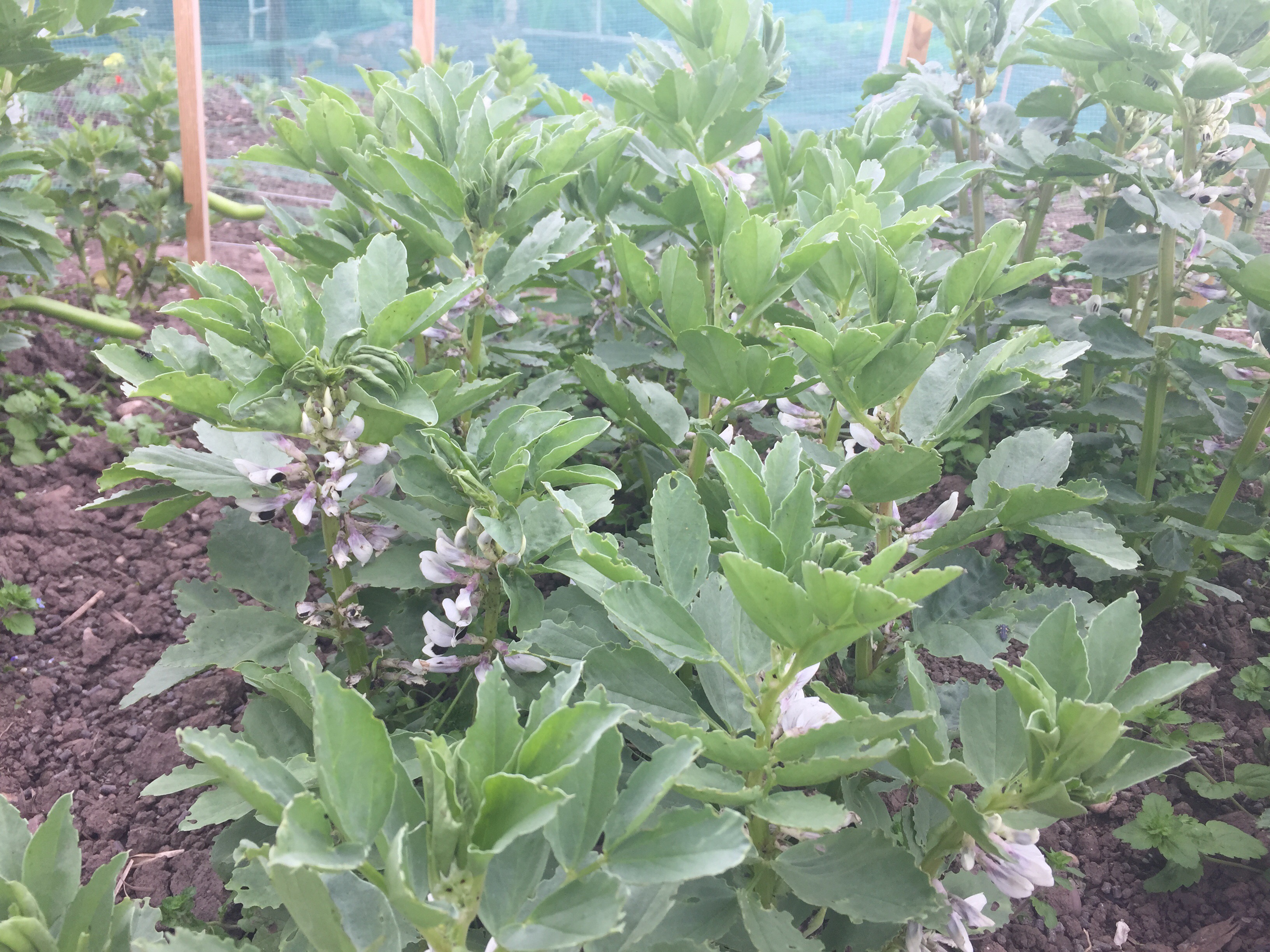 Tall varieties will need support which is usually done by staking every 1.5m along the row and stringing two wires, one at 30cm height, the other 60 cm height. Repeat on the other side of the double row. Field beans and dwarf beans should not need support.