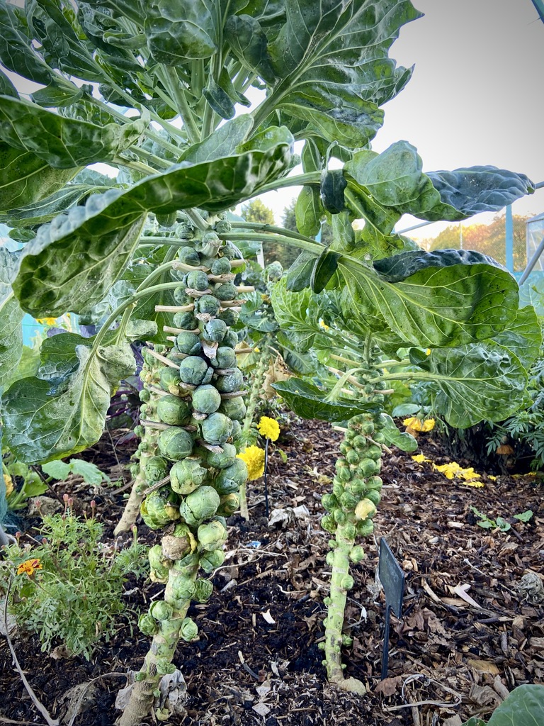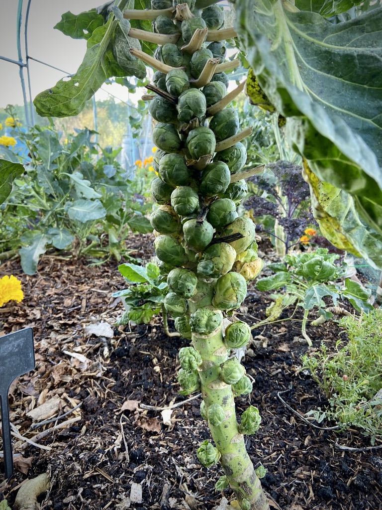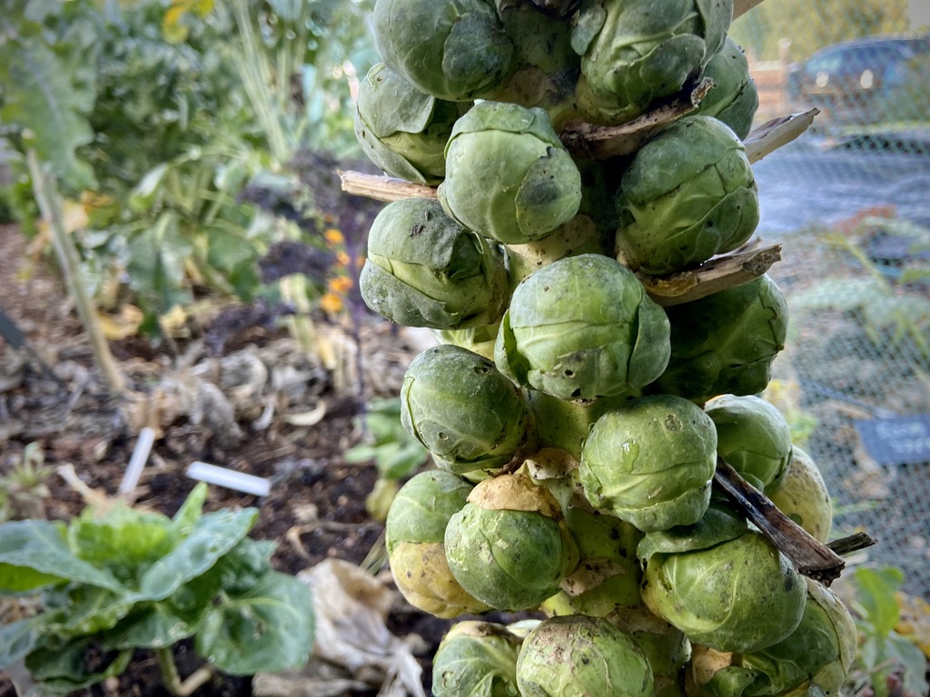 Once the plants have several true leaves plant out in final positions. Sprouts are not too fussy about sunlight but they do need a firm soil so you might struggle with a very sandy soil. In May to early June you will want to plant the sprouts in to their final positions. Harden off indoors plants for a week by leaving them outside during the day and bringing back in at night. Plant out leaving 60-80 cm in either direction. It can be helpful to stake sprout especially if you are on a windy site. They will appreciate a feed of blood fish and bone or another organic fertiliser in the spring and a mulch to conserve water. Commonly growers would sprinkle a little lime on the soil before planting as this helps to avoid club root but also sprouts like a slightly alkaline soil. If you want to do this though do it sparingly and follow manufacturing guidelines. Calcified seaweed and ground chalk are preferable to organic growers. Always wear a face mask and gloves when sprinkling lime and follow manufacturing instructions. Water in well and make sure that they are well watered until established. After this water only if it has been dry for several weeks.